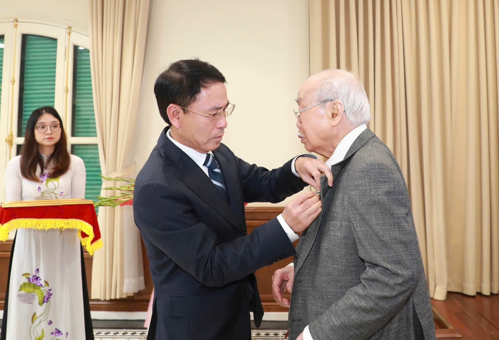 | Phó Bí thư Thành ủy Nguyễn Trọng Đông trao Huy hiệu 80 năm tuổi Đảng tặng đảng viên lão thành Nguyễn Tiến Hà |