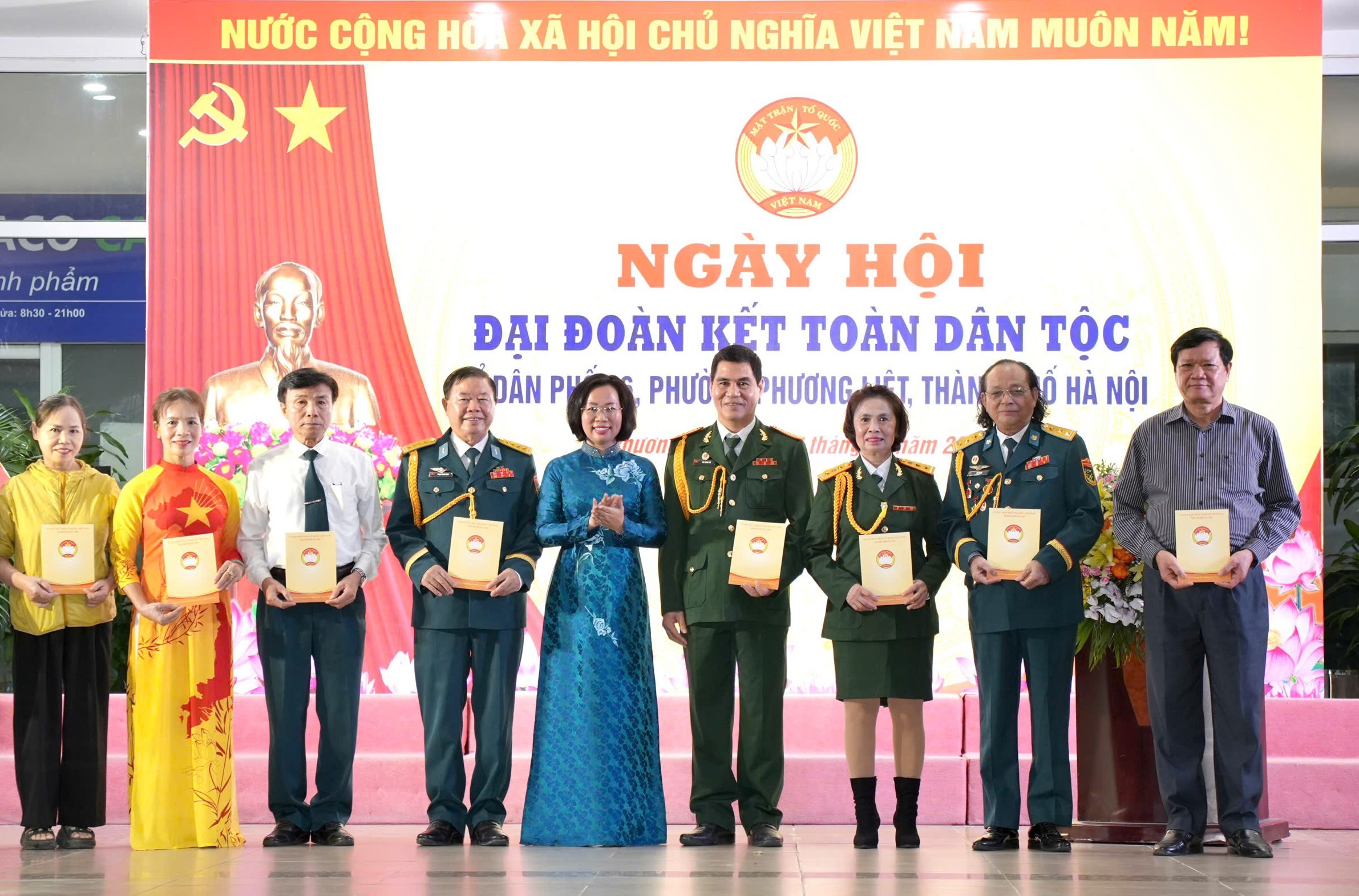 | Lãnh đạo phường Phương Liệt tặng hoa chúc mừng Ngày hội |