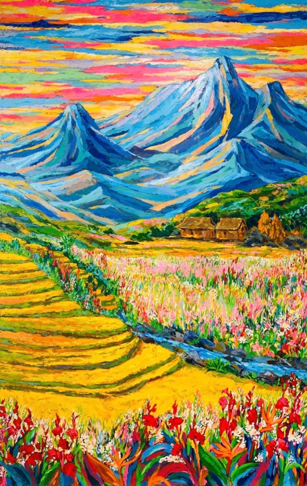Đặc biệt, cách các hoạ sĩ tái hiện vẻ đẹp của bản làng vùng cao Tây Bắc, nơi hoa mận, hoa đào, mái nhà bình yên và hình ảnh con giáp Bính Ngọ thong dong trên đồng cỏ, tất cả hòa quyện tạo nên bản giao hưởng màu sắc, gửi gắm thông điệp về niềm hy vọng và sự khởi đầu mới an khang…