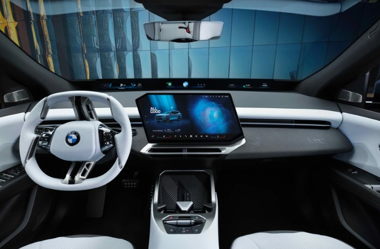 Không gian bên trong iX3 giữ gần như nguyên vẹn phong cách từ bản concept với BMW Panoramic iDrive. Điểm nổi bật là màn hình hiển thị Panoramic Vision trải dài theo kính chắn gió, kết hợp HUD 3D thế hệ mới, thay thế bảng đồng hồ truyền thống. Cụm điều khiển trung tâm trên xe được thiết kế nhỏ gọn, cần số dạng lẫy, bệ sạc không dây kép và nhiều cổng USB-C.