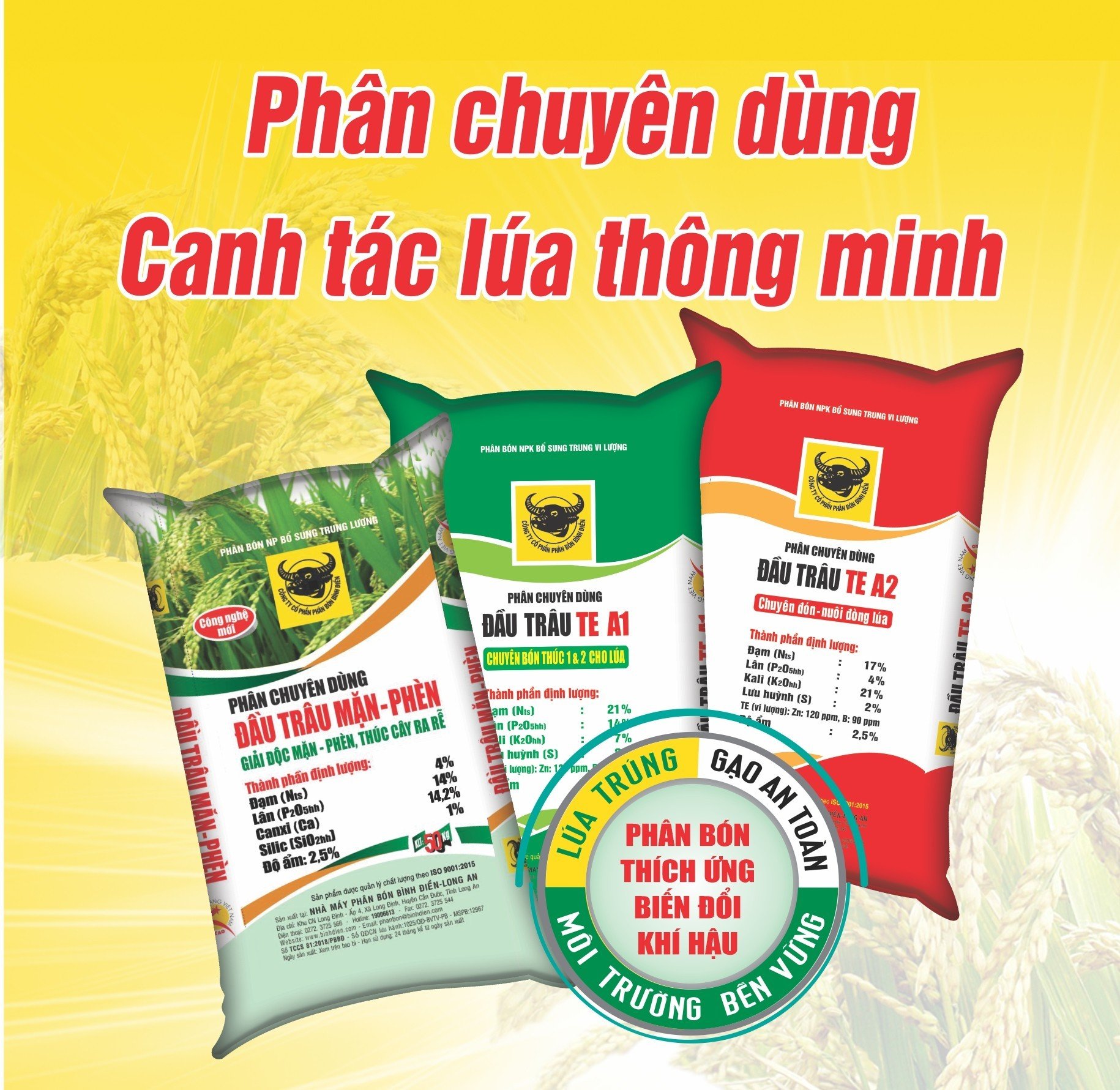 Bộ sản phẩm khuyến cáo sử dụng trong quy trình canh tác lúa thông minh: Đầu Trâu mặn - phèn (giúp nâng cao pH, tăng tính chống chịu của cây lúa với phèn, mặn và các điều kiện bất lợi khác) và bộ sản phẩm chuyên dùng lúa TE A1, TE A2 cung cấp dinh dưỡng cân đối và hợp lý với các giai đoạn sinh trưởng của cây lúa.