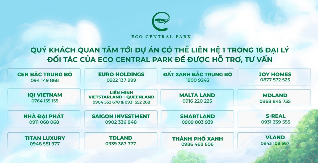 Quý khách hàng quan tâm dự án có thể liên hệ một trong các đại lý chính thức của Eco Central Park để được tư vấn, hỗ trợ.