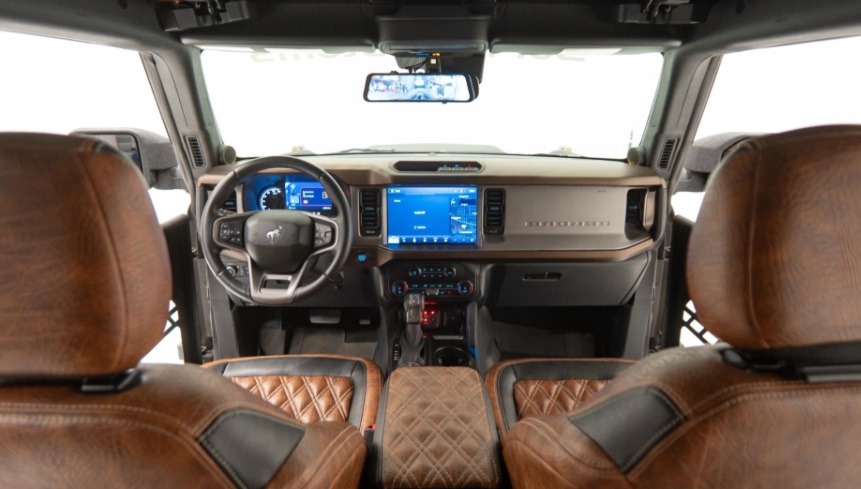 Ngoại hình của Bronco Apocalypse Dark Horse được hoàn thiện với lớp sơn đen mờ, kết hợp cùng các chi tiết thiết kế chuyên dụng cho off-road. Phần đầu xe sở hữu cản trước cỡ lớn tích hợp đèn LED trợ sáng, đi cùng nắp ca-pô Lawman thiết kế riêng, nhấn mạnh phong cách cơ bắp và tính thực dụng.