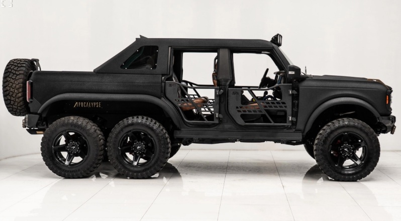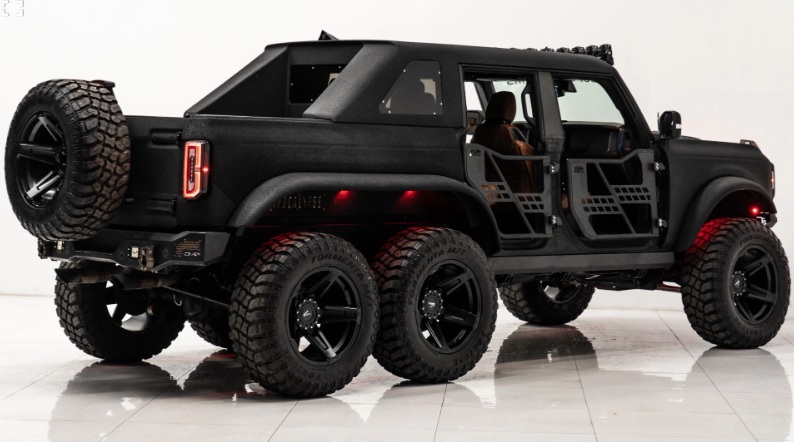 Điểm khác biệt lớn nhất của Apocalypse Dark Horse nằm ở cấu hình 6 bánh hiếm gặp. SoFlo đã kéo dài khung gầm, bổ sung thêm một trục sau, biến Bronco từ một mẫu SUV thuần off-road thành một chiếc bán tải 6x6 với khả năng vượt địa hình vượt trội và diện mạo không thể nhầm lẫn.