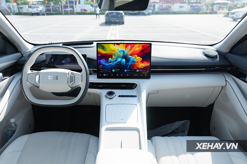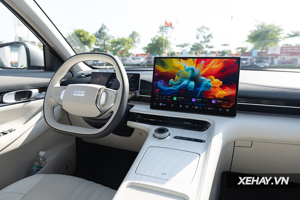 Ở chính giữa bảng táp-lô là màn hình thông tin giải trí với tấm nền hiển thị lên tới 15,4” độ phân giải 2,5K tương đương những mẫu laptop cỡ lớn. Người điều khiển xe sở hữu thêm một đồng hồ hiển thị dạng màn hình đặt ngang 10,2 inch và cả hệ thống hắt kính HUD. Hệ thống đèn nền nội thất của xe còn có thể thay đổi tới 256 màu khác nhau theo nhịp điệu nhạc, dễ dàng cô đọng cảm xúc cho hành khách. To, rõ ràng, sống động và sắc nét là những gì có thể tóm gọn khi nhận xét về “đường hình” của Geely EX5.