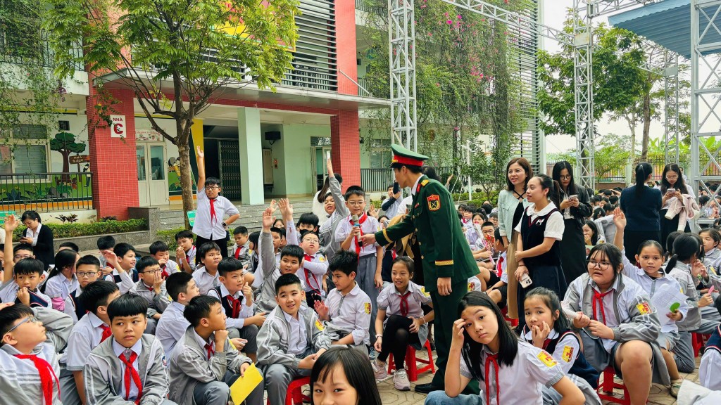 Phần hỏi - đáp giữa học sinh và khách mời đã tạo nên không khí sôi nổi, gần gũi. Những câu hỏi hồn nhiên nhưng sâu sắc như: “Điều gì giúp bác và đồng đội vượt qua hiểm nguy?”, “Vì sao bác chọn nghề báo sau khi rời quân ngũ?”, “Các chú bộ đội thời bình làm nhiệm vụ gì?”… đã được các khách mời trả lời bằng những câu chuyện giản dị, dễ hiểu, giúp các em nhận ra giá trị của lòng dũng cảm, tinh thần kỷ luật và trách nhiệm với cộng đồng.