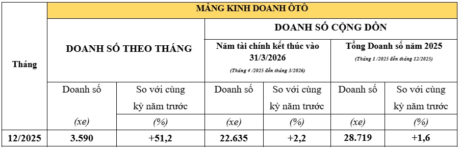 Trong khi đó, ở mảng kinh doanh ô tô, Honda Việt Nam ghi nhận doanh số tháng 12/2025 đạt 3.590 xe, tăng 51,2% so với cùng kỳ năm trước. Tổng doanh số cả năm 2025 là 28.719 xe, tăng 1,6% so với năm 2024. Cụ thể: