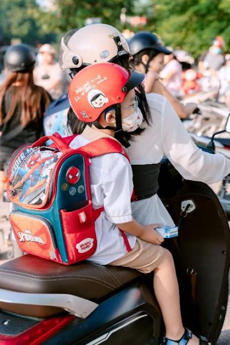 Người đi xe máy chở em nhỏ tham gia giao thông
