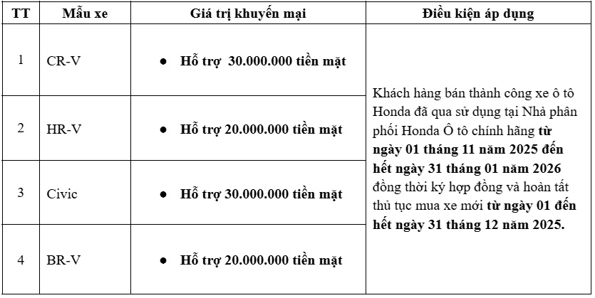 Chương trình được phối hợp triển khai cùng hệ thống nhà phân phối, dành cho khách hàng có nhu cầu bán xe Honda đã qua sử dụng và đổi sang các dòng xe mới gồm CR-V, Civic, BR-V và HR-V.