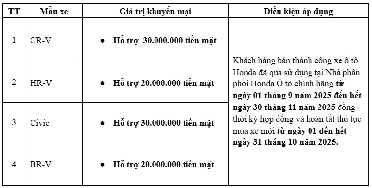 Từ ngày 01 tháng 10 năm 2025 đến hết ngày 31 tháng 10 năm 2025, Honda Việt Nam phối hợp cùng hệ thống Nhà Phân phối triển khai chương trình khuyến mại hấp dẫn cho khách hàng đổi xe mới chính hãng.