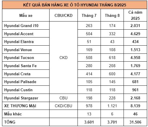 Hyundai bán được 3.701 xe trong tháng 8/2025