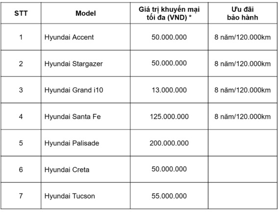 Theo đó, khách hàng mua bất kỳ phiên bản nào của các dòng xe Hyundai Palisade, Santa Fe, Tucson, Creta, Accent, Stargazer và Grand i10 trong tháng này sẽ có cơ hội nhận mức ưu đãi từ 23 triệu đến 200 triệu đồng, trong đó bao gồm quyền lợi Hội viên khách hàng Hyundai hạng Bạch Kim trị giá 10 triệu đồng.