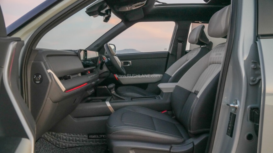 Nhờ kích thước gia tăng, không gian sử dụng của Seltos được cải thiện rõ rệt. Hàng ghế trước có khoảng để chân, khoảng đầu và vai rộng rãi, đi kèm tính năng thông gió ghế. Ghế lái chỉnh điện 10 hướng, có nhớ vị trí và liên kết với gương chiếu hậu, trong đó gương có khả năng tự hạ khi vào số lùi.