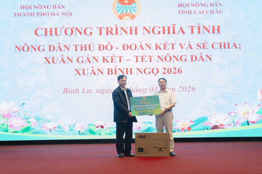 Tại đây, Đoàn công tác đã trao tặng 3 bộ máy tính và 150 suất quà Tết, với tổng trị giá 120 triệu đồng. Chương trình “Nghĩa tình Nông dân Thủ đô - Đoàn kết và sẻ chia; Xuân gắn kết - Tết Nông dân” là hoạt động giàu ý nghĩa nhân văn, góp phần tăng cường mối quan hệ đoàn kết, gắn bó giữa các cấp Hội Nông dân thành phố Hà Nội với Hội Nông dân tỉnh Lai Châu. Qua đó lan tỏa tinh thần tương thân tương ái, trách nhiệm vì cộng đồng của tổ chức Hội Nông dân, đặc biệt tại các địa phương vùng cao, vùng còn nhiều khó khăn.