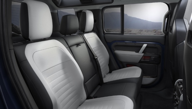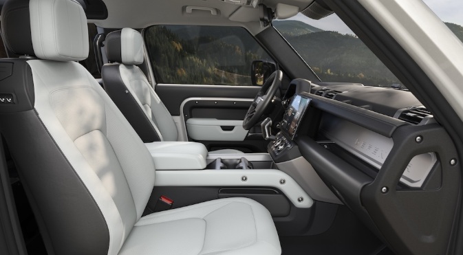 Khoang nội thất của Defender mới cũng được làm mới nhẹ. Màn hình trung tâm tăng lên kích thước 13,1 inch, hỗ trợ kết nối điện thoại thông minh hoàn toàn không dây. Bảng điều khiển trung tâm được thiết kế lại với một ngăn trượt kín để chứa vật dụng. Xe có thêm gói tùy chọn Signature Suite bổ sung các túi để đồ hai bên có thể tháo rời và đường giấu dây cáp, hướng đến sự tiện lợi trong sử dụng hằng ngày. Các chi tiết như vô-lăng, bảng đồng hồ hay thiết kế táp-lô vẫn giữ nguyên bố cục cũ.