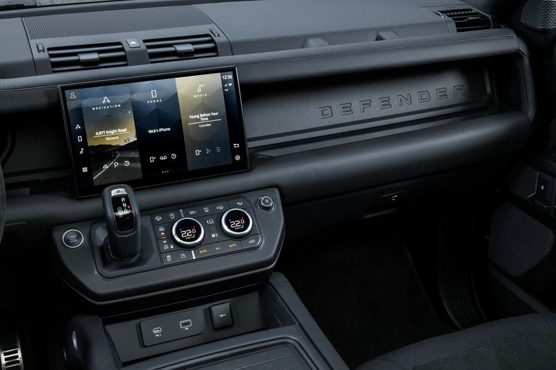 Bên trong khoang nội thất, Defender V8 được trang bị ghế ngồi bằng chất liệu Da Windsor Ebony độc đáo với các điểm nhấn bằng da lộn Miko và Robustec, mỗi chiếc được hoàn thiện với tem Ebony độc đáo, trong khi thanh ngang khoang lái lộ thiên của Defender có lớp hoàn thiện màu Đen nhám đặc biệt. Vô-lăng bốn chấu được nâng cấp bởi chất liệu Alcantara và lẫy chuyển số mạ crôm nhám đặc trưng của các mẫu xe động cơ V8. Nắp túi khí và cần số được bọc da, trong khi các tấm ốp nhôm in chữ V8 nổi bật.