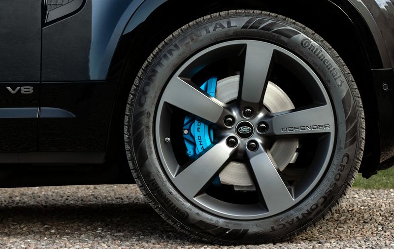 Có thể nhận ra ngay lập tức, Defender V8 với cải tiến thiết kế bên ngoài độc đáo; huy hiệu ngoại thất sản xuất riêng, cụm 4 ống xả đặc biệt và bánh xe hợp kim 22 inch độc đáo với lớp hoàn thiện màu Xám đậm nhám kết hợp để tạo nên sự khác biệt cho mẫu xe mạnh mẽ nhất trong dòng. Defender V8 còn được nhận diện bằng cùm phanh màu xanh dương Xenon và đĩa phanh 20 inch.