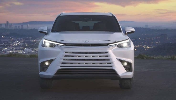 Phần đầu xe của Lexus TX 2024 nổi bật với lưới tản nhiệt mới áp dụng thiết kế "Unified Spindle" ưu tiên hiệu suất khí động học. Cụm đèn pha thanh mảnh với dải đèn LED chạy ban ngày hình chữ L ngược bắt mắt.
