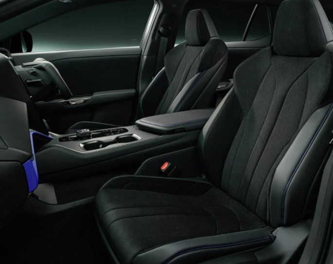 Bên trong khoang lái, Lexus mang đến một trải nghiệm đậm chất tương lai với vô-lăng dạng yoke độc đáo kết hợp cùng hệ thống lái điện tử steer-by-wire. Đặc biệt, chế độ "Interactive Manual Drive" được trang bị nhằm mô phỏng cảm giác sang số tay, giúp xóa tan định kiến về sự đơn điệu của xe điện và tăng cường sự kết nối giữa người lái và mặt đường. Không gian nội thất càng thêm sang trọng với ghế thể thao bọc da Ultrasuede cao cấp cùng các chi tiết trang trí màu xanh đặc trưng của dòng xe điện Lexus.