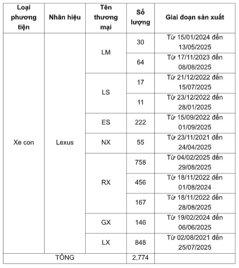 Chương trình sẽ được Lexus Việt Nam thực hiện chính thức từ ngày 30/12/2025 tại tất cả các Đại lý Lexus và Đại lý Toyota trên toàn quốc. Danh sách và số lượng xe tại Việt Nam bị ảnh hưởng cụ thể như sau: