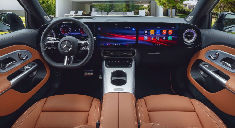 Khoang nội thất của GLB 2026 được lấy cảm hứng từ CLA mới, nổi bật với bảng táp-lô dạng màn hình toàn chiều rộng. GLB 2026 có ba màn hình: đồng hồ kỹ thuật số 10,25 inch và hai màn hình cảm ứng 14 inch cho trung tâm và ghế phụ. Hệ điều hành MB.OS hỗ trợ AI ChatGPT, Google Gemini, xem phim Disney+, Ridevu và chơi game đám mây qua Boosteroid. Hệ thống âm thanh Burmester 16 loa công suất 850 watt là tùy chọn cao cấp.