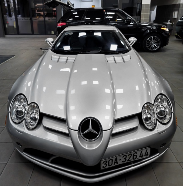 Chiếc Mercedes-Benz SLR McLaren hiện đang định cư tại Hà Nội sở hữu lớp sơn bạc Liquid Silver đặc trưng, đúng chuẩn ngôn ngữ thiết kế của dòng xe này. Theo thông tin, xe thuộc đời 2005 và là một trong số ít những chiếc SLR McLaren đặt chân đến Đông Nam Á, càng làm tăng giá trị sưu tầm.