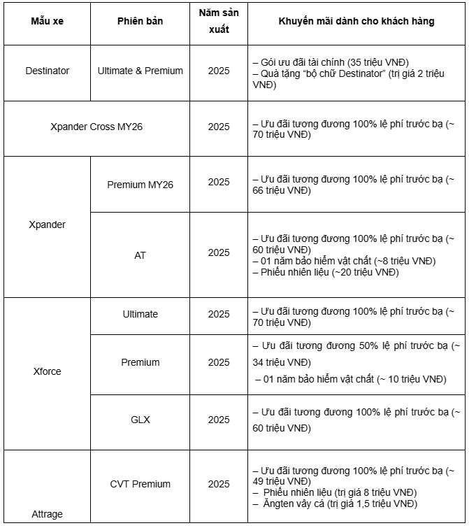 Đối với mẫu SUV 7 chỗ Destinator, trong tháng 1/2026 khách hàng tiếp tục được hưởng chương trình ưu đãi riêng cho cả hai phiên bản. Cụ thể, Mitsubishi Motors Việt Nam áp dụng gói ưu đãi tài chính có giá trị quy đổi khoảng 35 triệu đồng, kèm theo quà tặng bộ chữ “Destinator” trị giá 2 triệu đồng.