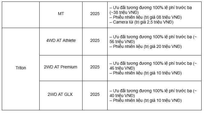 Mẫu bán tải All-New Triton cũng được Mitsubishi Motors Việt Nam đưa vào danh sách ưu đãi Tết với tổng giá trị hỗ trợ tối đa 76 triệu đồng. Gói khuyến mại bao gồm hỗ trợ 100% lệ phí trước bạ và phiếu nhiên liệu trị giá từ 10 đến 20 triệu đồng, tùy theo phiên bản.