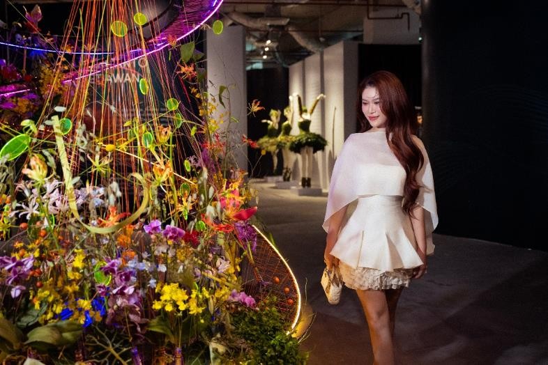 Còn Chloe Nguyễn thì lại đắm chìm mãi trong Pavillion of Flower – một ngôi nhà hoa được kết tạo từ hàng ngàn cành hoa tươi và khô, tựa như một khu vườn thu nhỏ đầy thi vị. Người xem có thể bước vào để chạm, để hít hà hương thơm, cảm nhận dòng năng lượng thuần khiết mà tự nhiên gửi gắm.