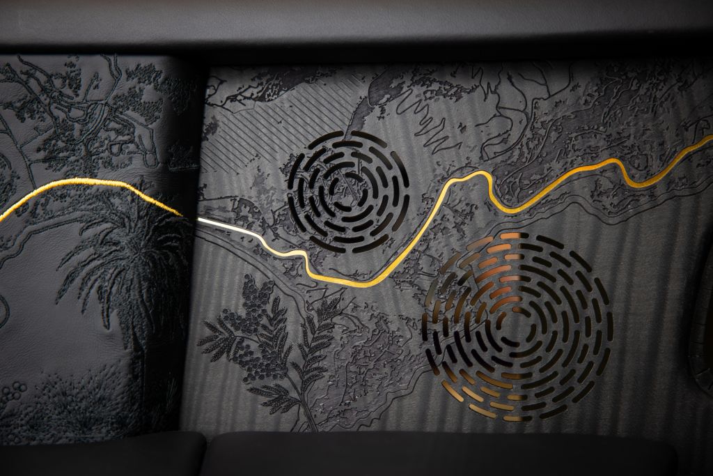 Điểm nhấn là bộ ốp cửa được hãng gọi là “phức tạp nhất trong lịch sử Rolls-Royce”. Để hoàn thiện riêng hạng mục này, các nghệ nhân đã mất một năm nghiên cứu và chế tác. Tác phẩm mang tính nghệ thuật cao, kết hợp bản đồ, tuyến đường, phong cảnh, hoa cỏ và hình ảnh các mẫu xe thử nghiệm, tất cả hòa trộn thành một bố cục liền mạch.