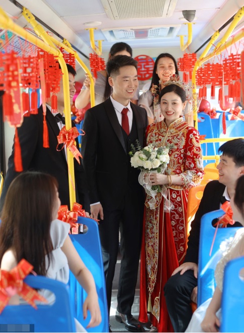 Theo video đám cưới được đăng tải, cặp vợ chồng ở tỉnh Hồ Bắc (Trung Quốc) đã đặt một chiếc xe buýt điện làm xe cưới. Chiếc xe được dán chữ hỷ, trang trí xung quanh bằng rất nhiều bóng bay và ruy băng đỏ. Trên xe không chỉ có cô dâu chú rể mà còn có rất đông bạn bè tới chung vui và chúc phúc cho hai vợ chồng.