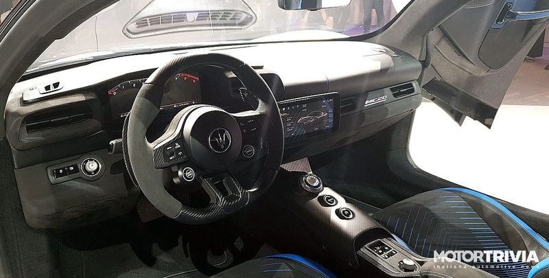 Khoang cabin của MC20 có thiết kế đơn giản theo phong cách thể thao. Chất liệu chủ đạo trên mẫu xe này là sợi carbon và da Alcantara với đường chỉ thêu màu xanh làm điểm nhấn. Vô-lăng tích hợp nút khởi động cùng các phím chức năng khác. Cụm đồng hồ kỹ thuật số và màn hình giải trí đều có kích thước 10 inch, sử dụng hệ điều hành Maserati Intelligent Assistant (MIA). Bảng điều khiển trung tâm của Maserati MC20 được hoàn thiện bằng sợi carbon với hốc sạc không dây và núm điều chỉnh chế độ lái.