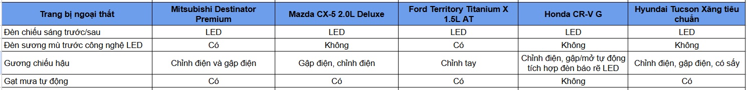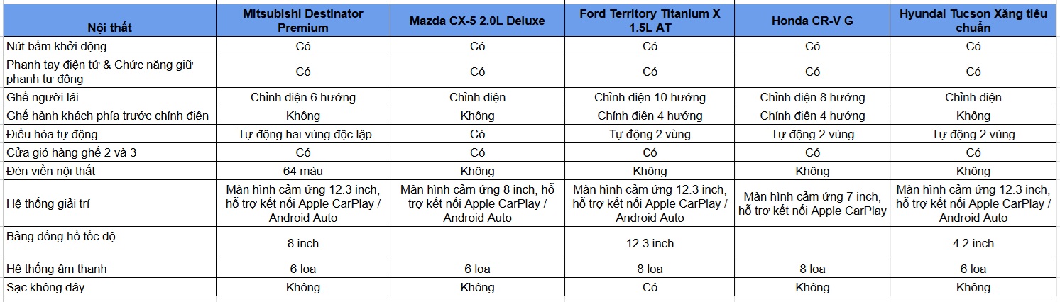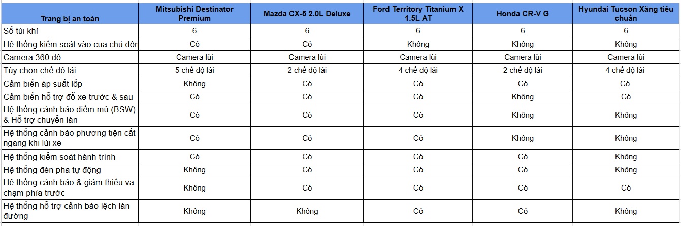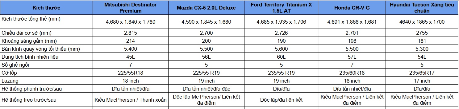 Qua các hạng mục so sánh, có thể thấy năm mẫu xe đều sở hữu những lợi thế riêng và hướng đến các nhóm khách hàng khác nhau. Mitsubishi Destinator nổi bật nhờ cấu hình 7 chỗ rộng rãi và khả năng vận hành linh hoạt trên nhiều điều kiện đường. Mazda CX-5 giữ phong độ ổn định với trải nghiệm lái cân bằng và danh sách an toàn tiêu chuẩn hợp lý. Ford Territory ghi điểm bằng công nghệ và trang bị phong phú trong tầm giá, còn Hyundai Tucson lại hấp dẫn nhờ thiết kế hiện đại, không gian sử dụng tốt. Honda CR-V tiếp tục thể hiện vị thế dẫn đầu với bộ an toàn Honda Sensing và khả năng vận hành ổn định, tiết kiệm.