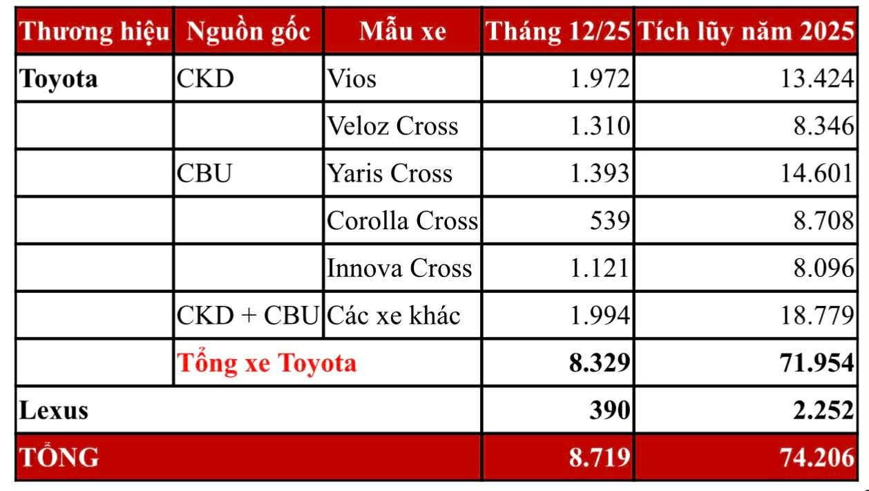 Cụ thể, doanh số toàn quốc của các mẫu xe Toyota đạt 8.329 xe, bao gồm 3.597 xe lắp ráp trong nước và 4.732 xe nhập khẩu nguyên chiếc, nâng tổng doanh số tích lũy năm 2025 lên 71.954 xe và tăng 8% so với năm 2024.