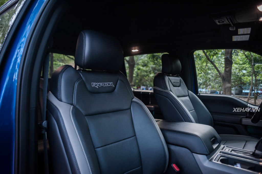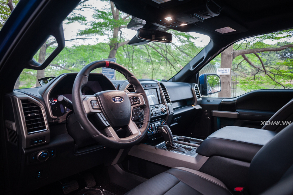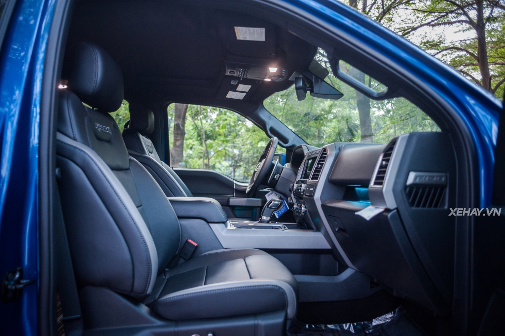 Nội thất của chiếc F-150 Raptor 2017 vừa được nhập về Việt Nam được phối màu đen, đi cùng với những đường viền trang trí màu xám trên ghế ngồi. Ghế lái có thể chỉnh điện 10 hướng, hệ thống thông tin giải trí SYNC 3 tích hợp định vị, vi sai trước Torsen chống trượt, camera quan sát 360 độ và gương chiếu hậu tích hợp đèn LED.