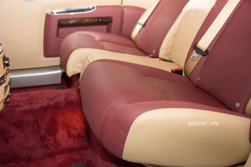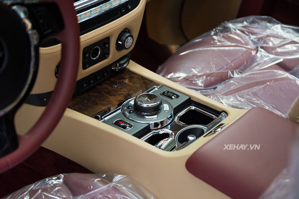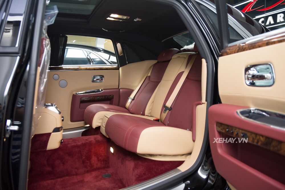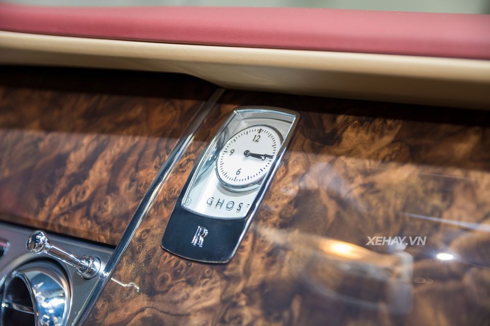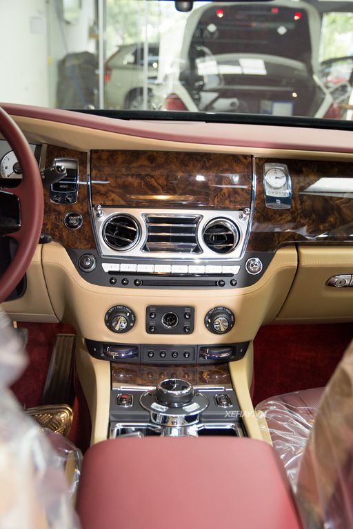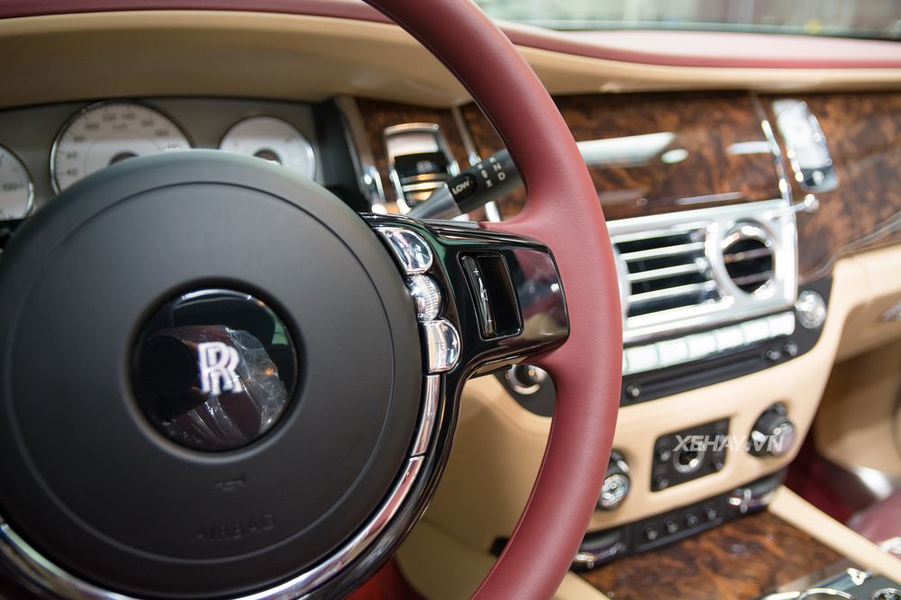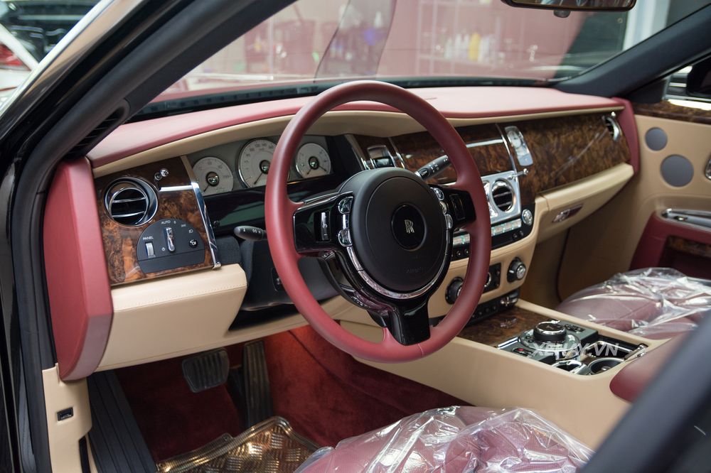 Không gian nội thất Rolls Royce Ghost được sử dụng trắng kem làm chủ đạo, màu đỏ sử dụng cho ghế ngồi, ốp cửa, bảng táp lô, vô lăng,.... Toàn bộ khu vực bảng táp lô được bọc chất liệu da cao cấp và ốp gỗ bóng mang đến sự tinh tế và sang trọng.