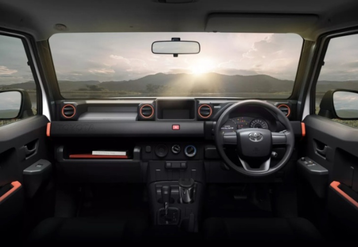 Bên trong khoang cabin của Hilux Champ Super SWB được thiết kế theo hướng tối giản. Xe có ghế nỉ màu đen điểm họa tiết cam tạo cảm giác khỏe khoắn. Xe không có màn hình giải trí trung tâm, thay vào đó tập trung vào các trang bị thiết yếu như điều hòa cơ, cửa sổ và gương chỉnh điện, ghế chỉnh tay, cổng USB Type-C, hai loa và tấm che nắng.