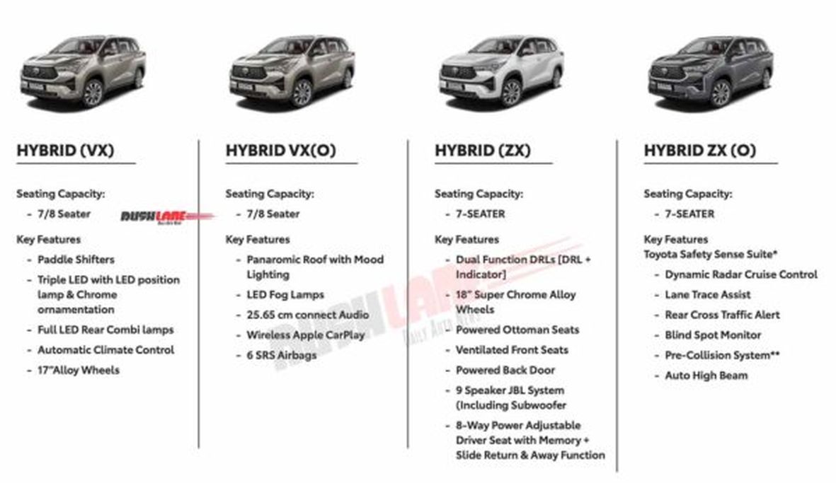 Bên cạnh việc tăng giá, Toyota còn giới thiệu một biến thể mới với tên gọi Hybrid Innova HyCross - VX (O). Biến thể mới này được định vị nằm giữa VX và ZX. Như vậy, Toyota Innova Hycross 2023 hiện đang được phân phối tổng cộng 6 phiên bản tại Ấn Độ, bao gồm: G, GX, VX, ZX, ZX (O) và VX (O).
