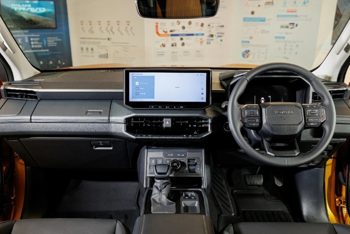 Khoang cabin của Hilux mới được nâng cấp mạnh mẽ với màn hình kỹ thuật số 12,3 inch sau vô-lăng, kết hợp màn hình trung tâm 12,3 inch hỗ trợ Apple CarPlay và Android Auto không dây. Xe còn có các tiện ích như: phanh tay điện tử, sạc không dây, điều hòa tự động hai vùng và hệ thống đèn LED toàn bộ được trang bị tiêu chuẩn trên hầu hết các bản cao.