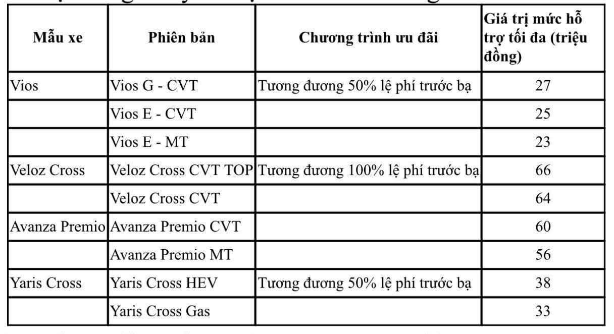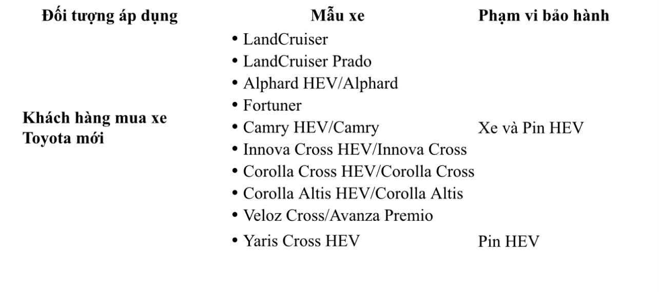 Chương trình áp dụng khi mua mới một số dòng xe do Toyota Việt Nam phân phối thông qua hệ thống Đại lý Ủy quyền chính hãng trên toàn quốc, chi tiết như sau: