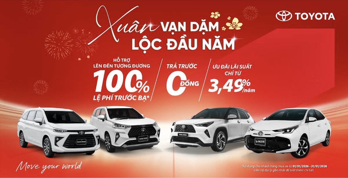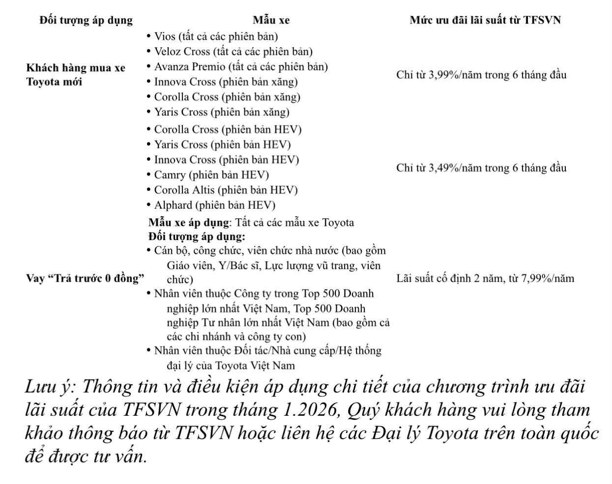 Ngoài ra, trong tháng 1/2026, Công ty tài chính Toyota Việt Nam (TFSVN) cũng thực hiện chương trình ưu đãi cho các khách hàng vay mua xe với mức lãi suất ưu đãi hấp dẫn