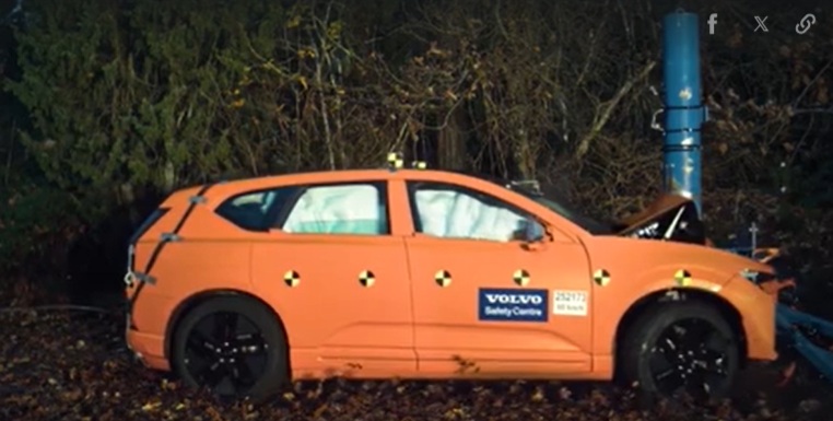 Trong kịch bản mô phỏng tình huống tài xế Volvo EX60 mất lái đâm trực diện vào cây hoặc cột điện, chiếc Volvo EX60 đã lao thẳng từ trong nhà ra ngoài trời với tốc độ 60 km/h trước khi va chạm cực mạnh với một cột kim loại. Cú đâm trực diện khiến phần đầu xe gần như bị xé toạc làm đôi, tạo nên một khung cảnh kinh hoàng nhưng lại chứa đựng những thông số kỹ thuật ấn tượng về khả năng hấp thụ xung lực.