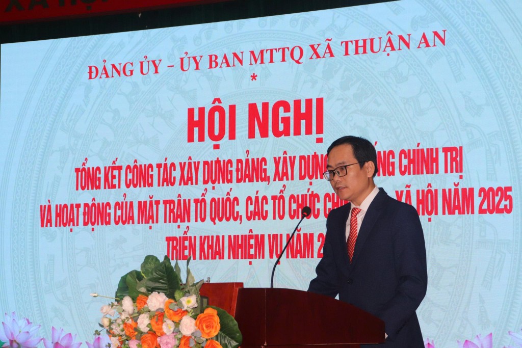 Xã cũng tập trung chỉ đạo tổ chức đại hội (hội nghị) các chi, đảng bộ cơ sở đảm bảo đúng tiến độ; tổ chức Đại hội đại biểu Đảng bộ xã Thuận An lần thứ I, nhiệm kỳ 2025 - 2030, với 187 đại biểu dự Đại hội. Đại hội đã tổng kết, đánh giá những kết quả đã đạt được; những tồn tại, hạn chế, làm rõ nguyên nhân, từ đó rút ra những bài học kinh nghiệm trong nhiệm kỳ 2020 - 2025; xác định phương hướng, mục tiêu, giải pháp trong nhiệm kỳ 2025 - 2030 và những năm tiếp theo, với 25 chỉ tiêu cụ thể, 5 nhiệm vụ trọng tâm, 3 khâu đột phá và những giải pháp chủ yếu.