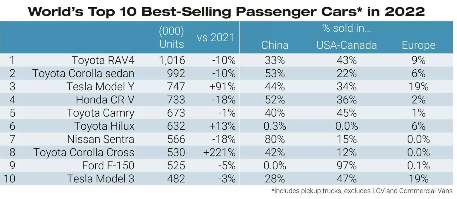 Mẫu xe thứ 2 nằm trong danh sách 10 mẫu xe bán chạy nhất là Tesla Model 3 ở vị trí thứ 10. Tuy nhiên, kết quả này đã tụt 1 bậc so với năm 2021. Còn lại, Toyota có 5 mẫu xe vào top 10, trong khi Ford, Nissan và Honda mỗi hãng có 1 mẫu.