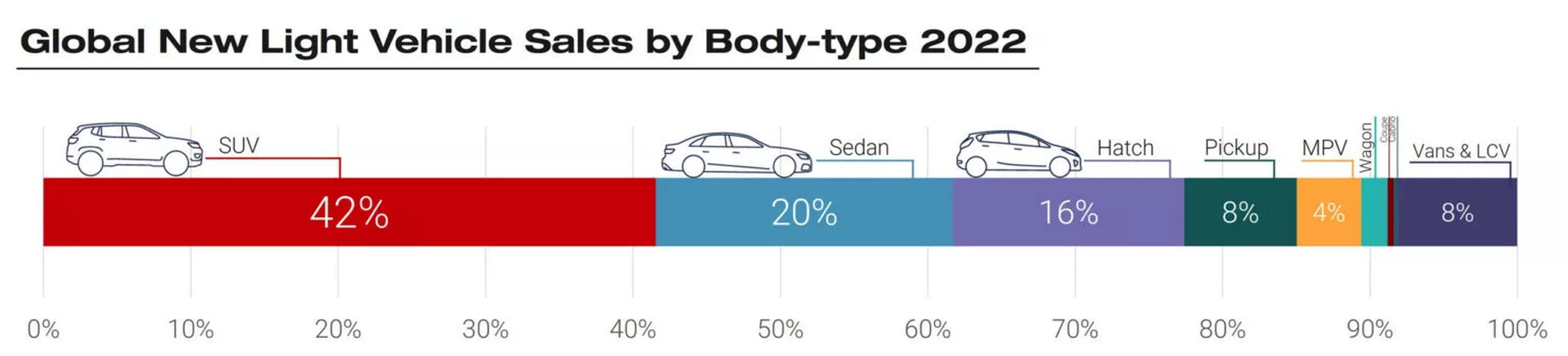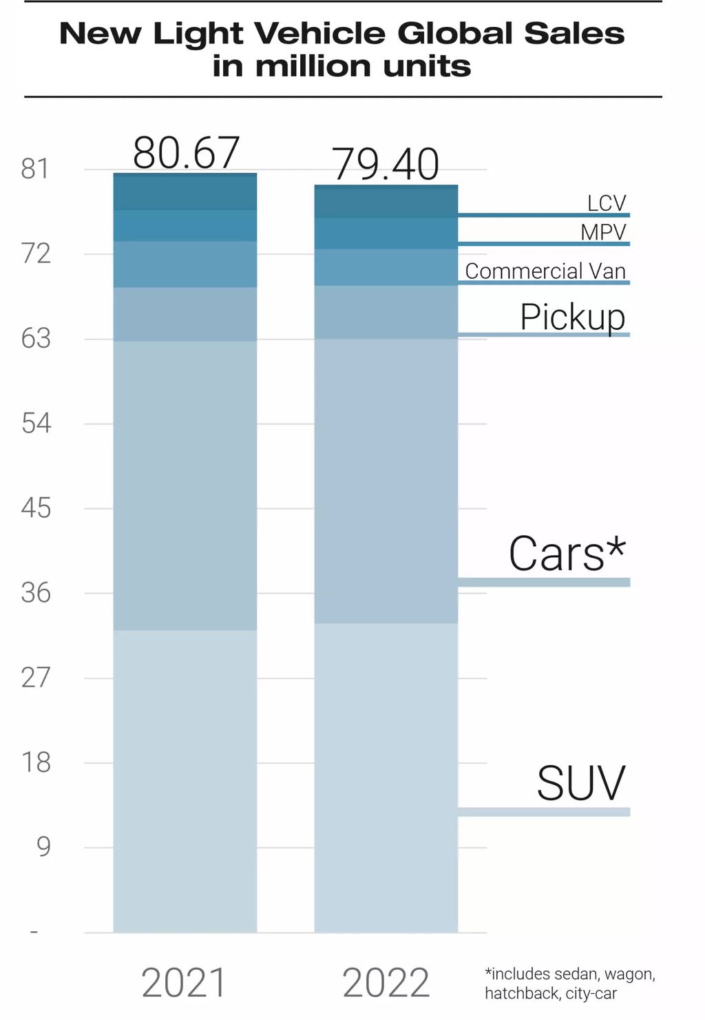 Theo dữ liệu của JATO Dynamics, 79,4 triệu xe mới đã được đăng ký trên toàn cầu vào năm 2022, giảm 2% so với 80,7 triệu xe đăng ký vào năm 2021. Ở một số thị trường mới nổi (Ấn Độ, Trung Đông, Đông Nam Á, Châu Phi) doanh số bán xe ô tô khá khả quan, chiếm 24% khối lượng toàn cầu, đủ để bù lại sự sụt giảm ở Bắc Mỹ, Châu Âu và Trung Quốc.