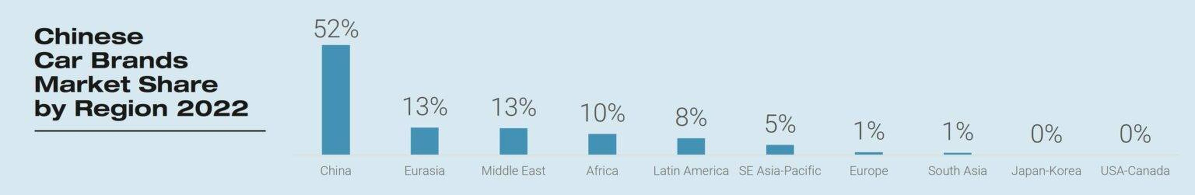 Sự tăng trưởng của các OEM của Trung Quốc cũng đang được cảm nhận ở các thị trường mới nổi nơi thị phần của họ đã tăng từ 4,8% vào năm 2021 lên 6,4% vào năm ngoái. Mặc dù đây vẫn là một tỷ lệ tương đối nhỏ, nhưng các nhà sản xuất Trung Quốc đã thành công trong việc giành thị phần từ các nhà sản xuất ô tô châu Âu và Hàn Quốc. Ở các khu vực như Eurasia, thị phần của các OEM Trung Quốc đã tăng hơn gấp đôi, tăng từ 6,2% năm 2021 lên 12,8% vào năm 2022.